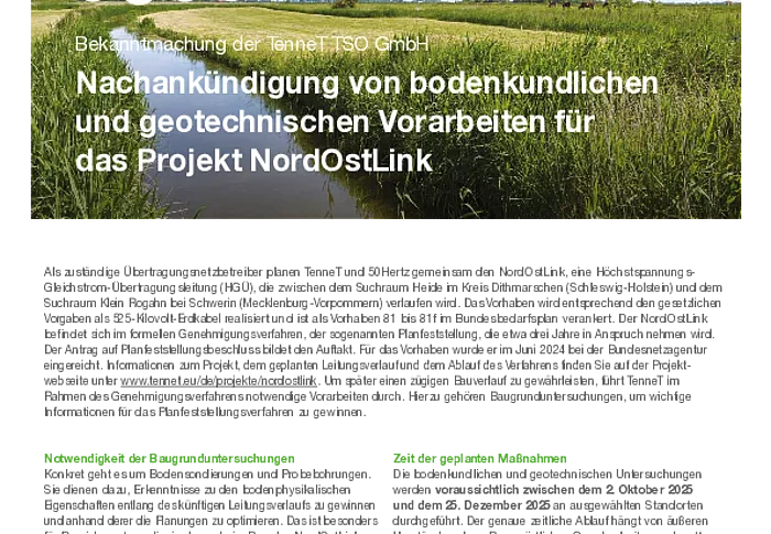 Bekanntmachung der TenneT TSO GmbH - Informationen zu Baugrundvoruntersuchungen (Bauvorbereitende Maßnahme gem. § 44 EnWG) 380-/110-kV-Leitung Hochwöhrden - Pöschendorf